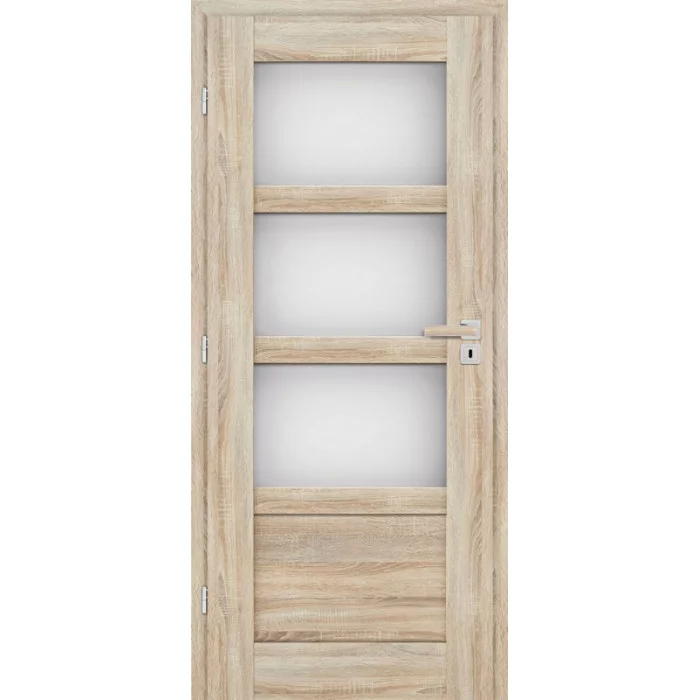 KONSTRUKCE Křídlo vyrobené v rámové technologii STILE. Masivní 14cm rám MDF pro povrchy 3D GREKO. Masivní 14 cm dřevěný rám pro povrchy PREMIUM a CPL LAMINÁT, za příplatek ve vybraných odstínech Masivní zpevňující příčky o tloušťce 22 mm. Pevný kolíkový spoj a na perodrážku – zvýšená pevnost dveří. Estetické zasklení bez použití rámečku přidává dveřím luxusní vzhled. Mírně zaoblené hrany dveří, na hraně nejsou žádné spoje, což přispívá k delší životnosti dveří. Povrchová úprava: nejpopulárnější povrch 3D GREKO se zvýrazněnou strukturou dřeva, CPL LAMINÁT se zvýšenou odolností nebo strukturovaný velice odolný povrch PREMIUM. Možnost objednání dveří vyšších o 4,5cm včetně zárubní s příplatkem. KOVÁNÍ Tři stříbrné panty šroubovací s horizontální regulací ve falcovém provedení nebo tři stříbrné skryté panty s horizontální a vertikální regulací v bezfalcovém provedení. Klasický zámek ve falcovém nebo magnetický v bezfalcovém křídle na dozický klíč, na cylindrickou vložku, WC zámek, úsporný zámek (jen klika). PROSKLENÍ 4 mm tvrzené matné nebo čiré sklo v ceně dveří, cena je stejná pro všechny varianty prosklení. Možnost volby matné (A-avers) a hladké (R-revers) strany.